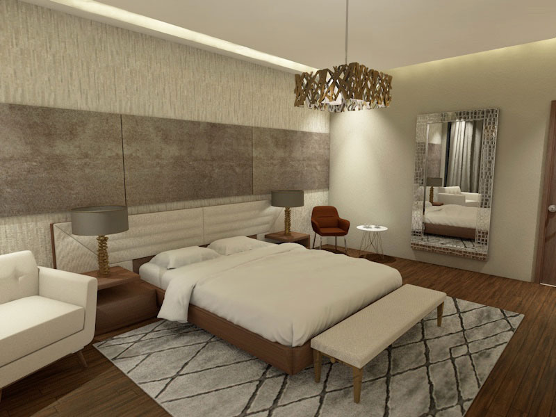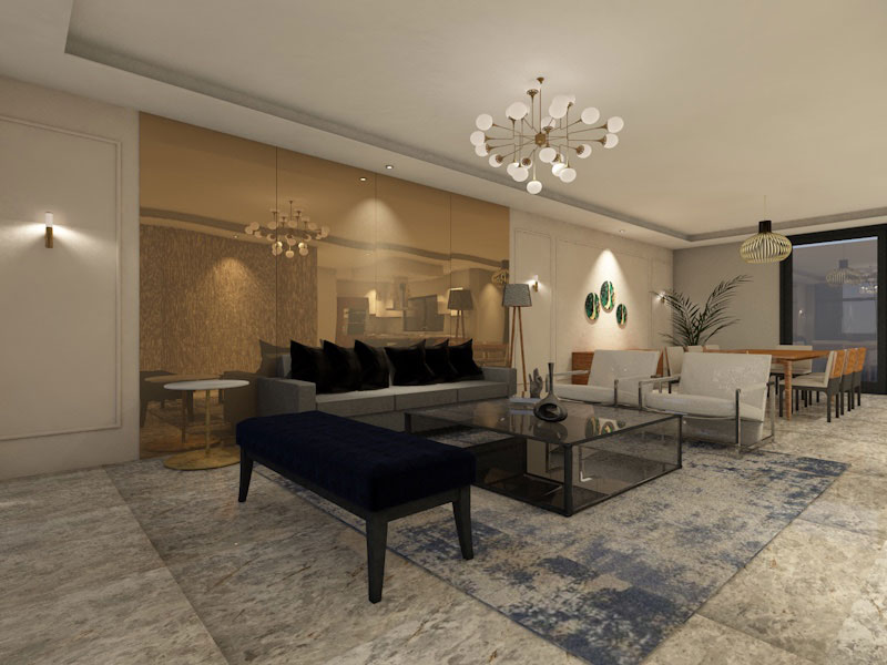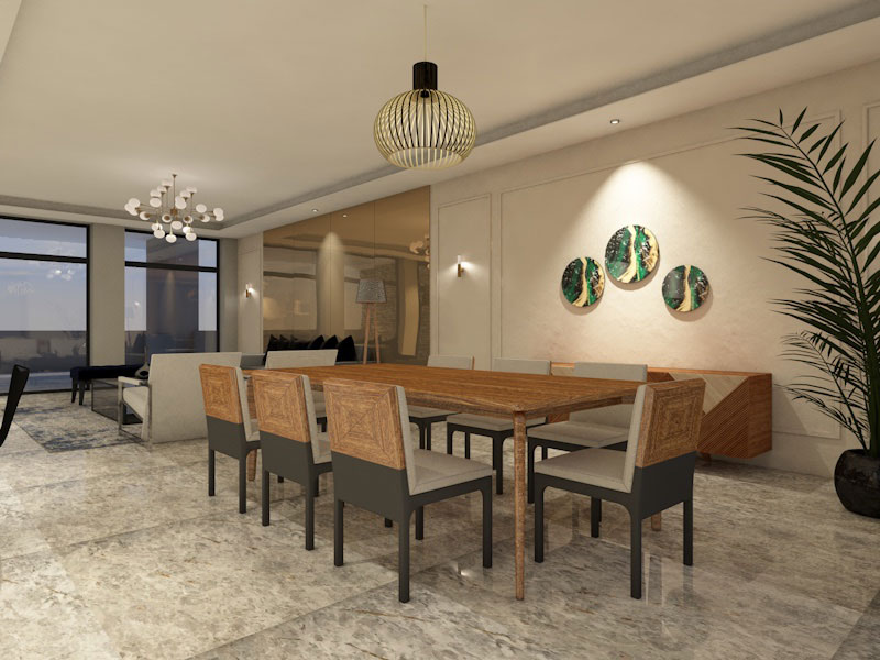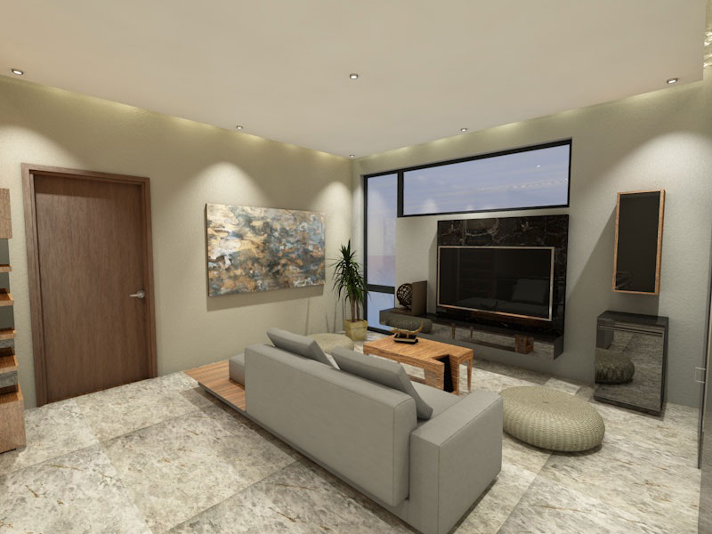 Estilo contemporáneo/ moderno, donde los diferentes materiales y sus contrastes son la herramienta principal para cada área. La luz natural en combinación con la artificial y espejos, reflejan un juego de sombras y es ahí donde las texturas lucen en su máxima expresión.